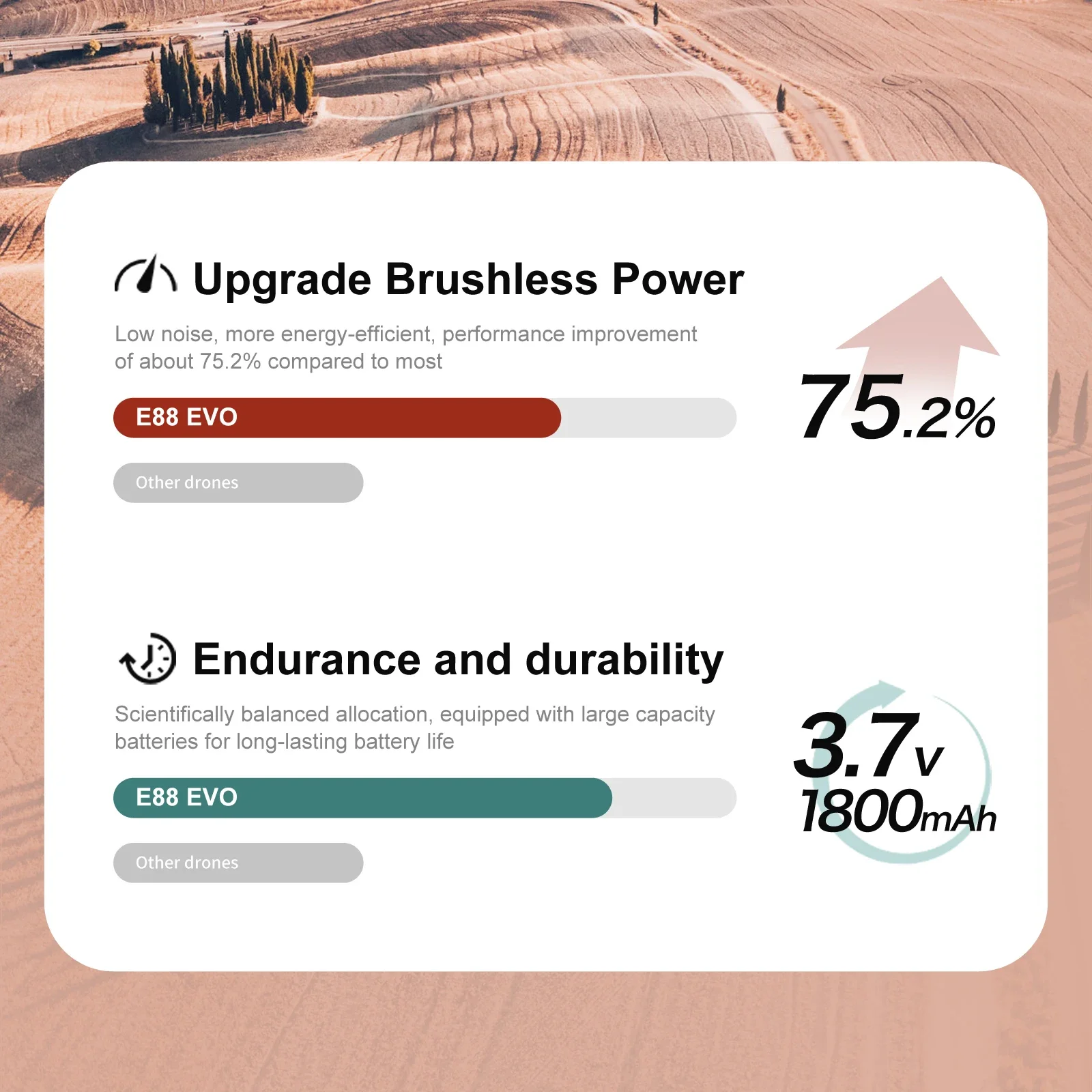 - Drone With 4K HD Camera】The E88 drone is equipped with a high definition camera with adjustable angle. With the 120° wide-angle setting, Capture a HD footage and directly saved, share the amazing view to social media with just one click.