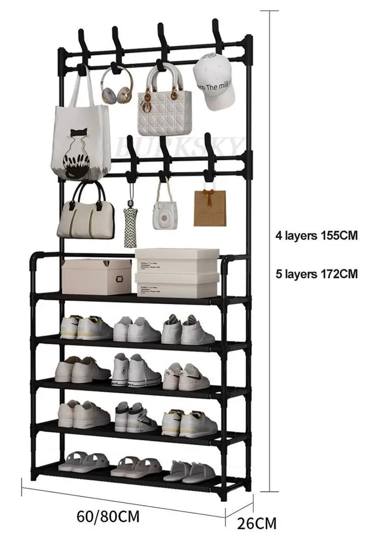 1. Multi functional shoe rack with 8 coat and hat hooks and multiple layers of shoe racks 2. Metal material with stronger load-bearing capacity 3. Easy to install and expand storage space